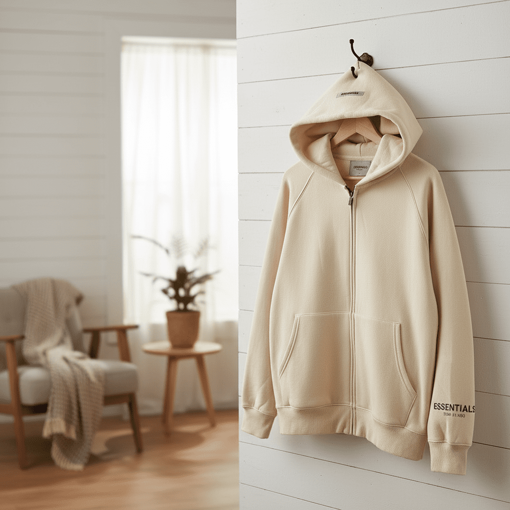 Essentials Off-White Zip Hoodie crafted from soft cotton, offering warmth and comfort. Full zip front, kangaroo pocket, ribbed cuffs and hem, logo on sleeve. Unisex streetwear for daily casual style.