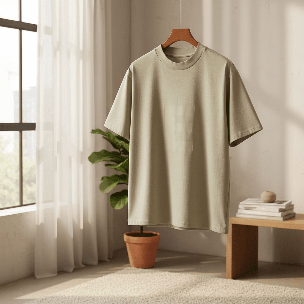 Essentials Khaki Basic T-Shirt, crafted from soft breathable cotton, features bold front letter E, unisex design, minimalist streetwear style for effortless everyday comfort and fashion.