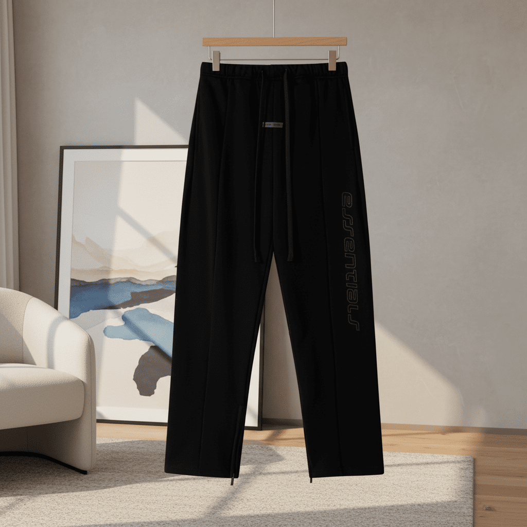 Essentials Black Casual Pants made from premium cotton blend, soft, breathable, and comfortable. Adjustable drawstring waist, side logo lettering, unisex street style perfect for daily fashion wear.