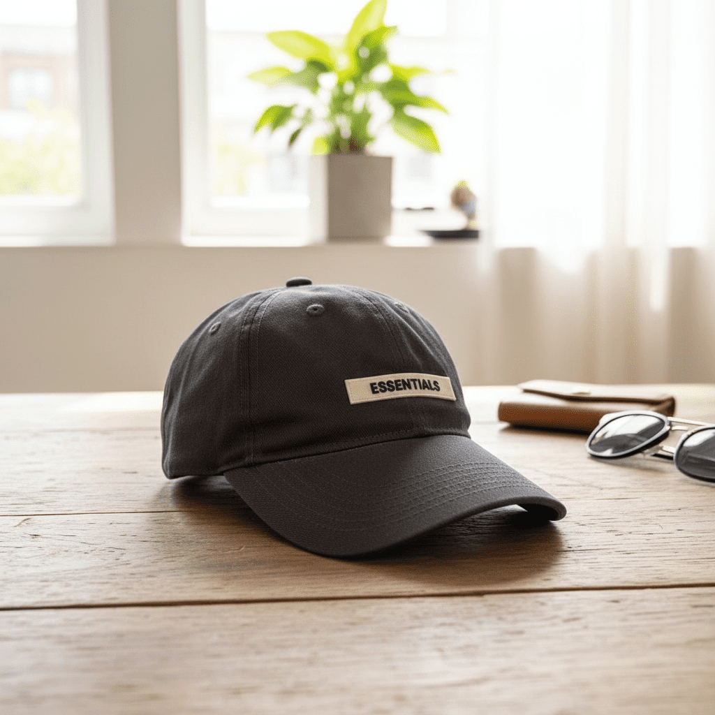 ESSENTIALS Dark Gray Cotton Baseball Cap features a classic adjustable design with front logo emblem, unisex style for street fashion, perfect for sun protection and daily wear.