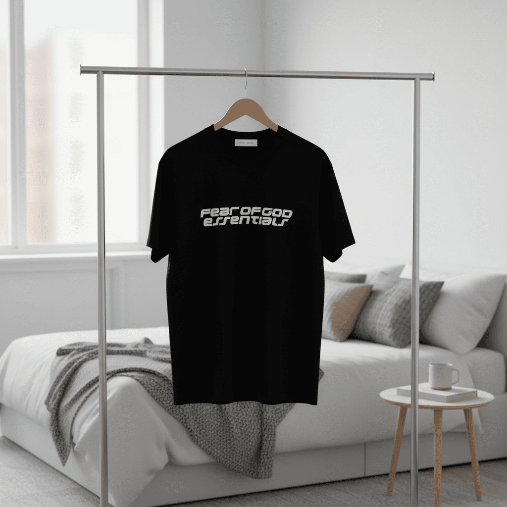 Fear of God Essentials Black Cotton T-Shirt, featuring soft breathable premium fabric and bold white logo print, unisex streetwear style for comfortable everyday fashion.