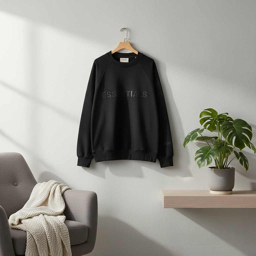 Essentials Black Crewneck Sweatshirt made from premium cotton, soft and breathable. Minimalist street style with logo print, perfect for men and women, casual wear with a modern, trendy look.