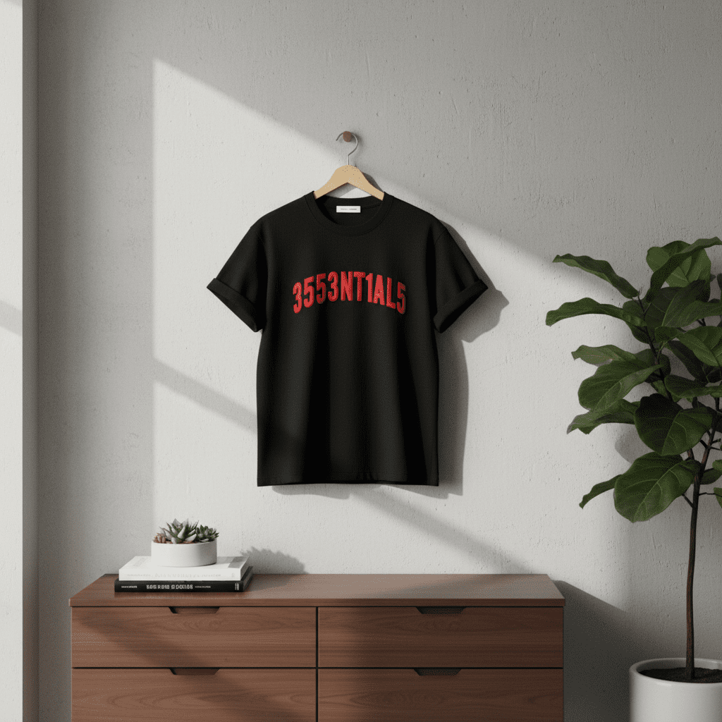 Essentials Black Letter Print T-Shirt made from high-quality cotton, soft and breathable, featuring red 3553NT1AL5 front and CH1CA60 back print, unisex streetwear for casual and trendy style.