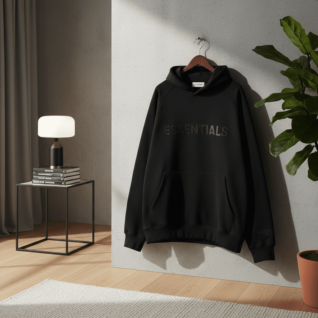 ESSENTIALS Black Hoodie – Made of premium cotton for soft, breathable comfort. Features a hood, kangaroo pocket, and logo prints on chest and sleeve. Unisex streetwear for stylish everyday wear.