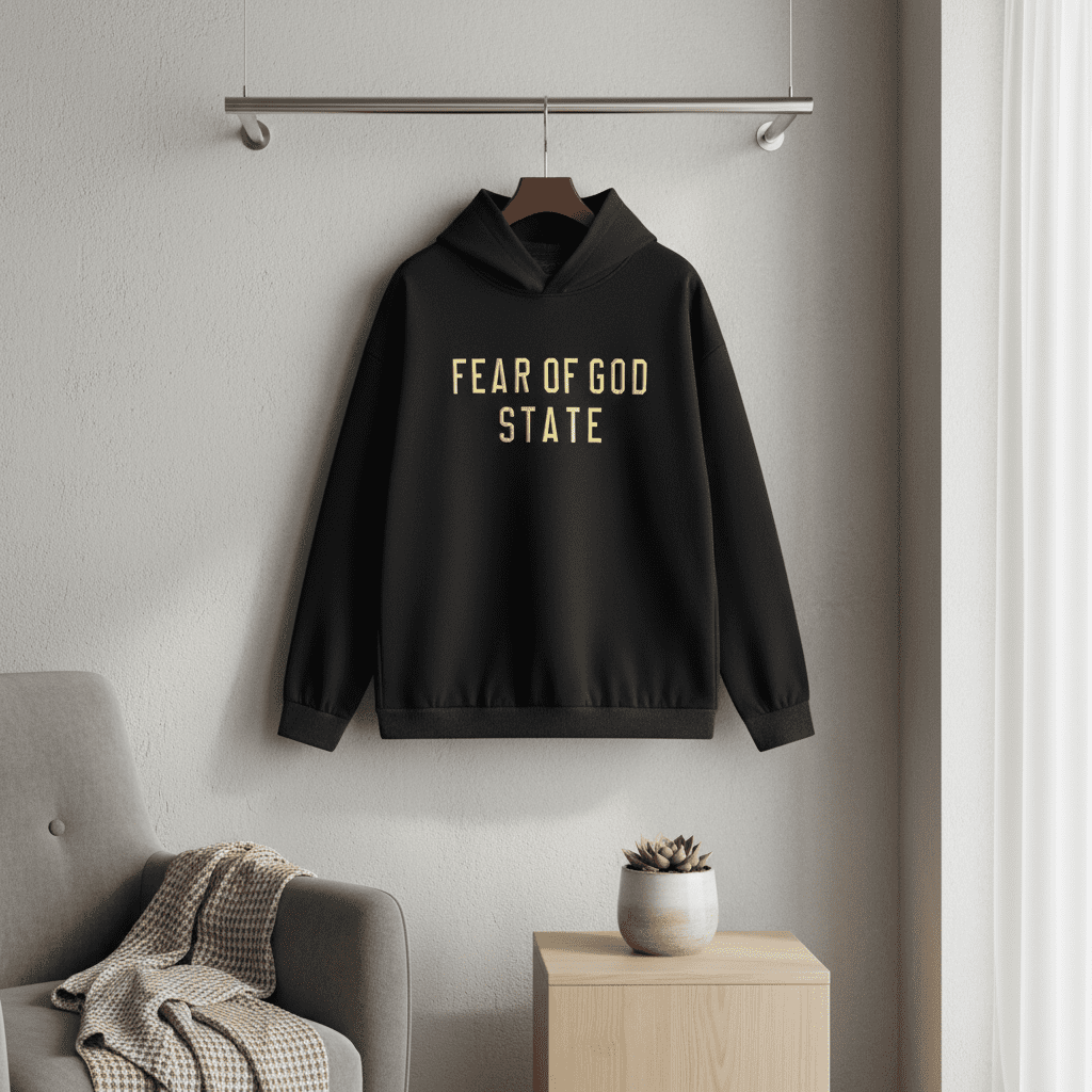 Fear of God Essentials black hoodie crafted from soft breathable cotton, featuring gold “FEAR OF GOD STATE” print, streetwear unisex style perfect for casual and fashion-forward looks.