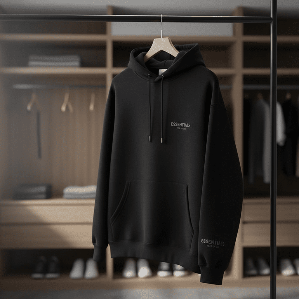 Essentials Classic Black Hoodie – premium cotton for soft comfort, logo print on chest and cuff, drawstring hood, kangaroo pocket, unisex streetwear for daily casual style.