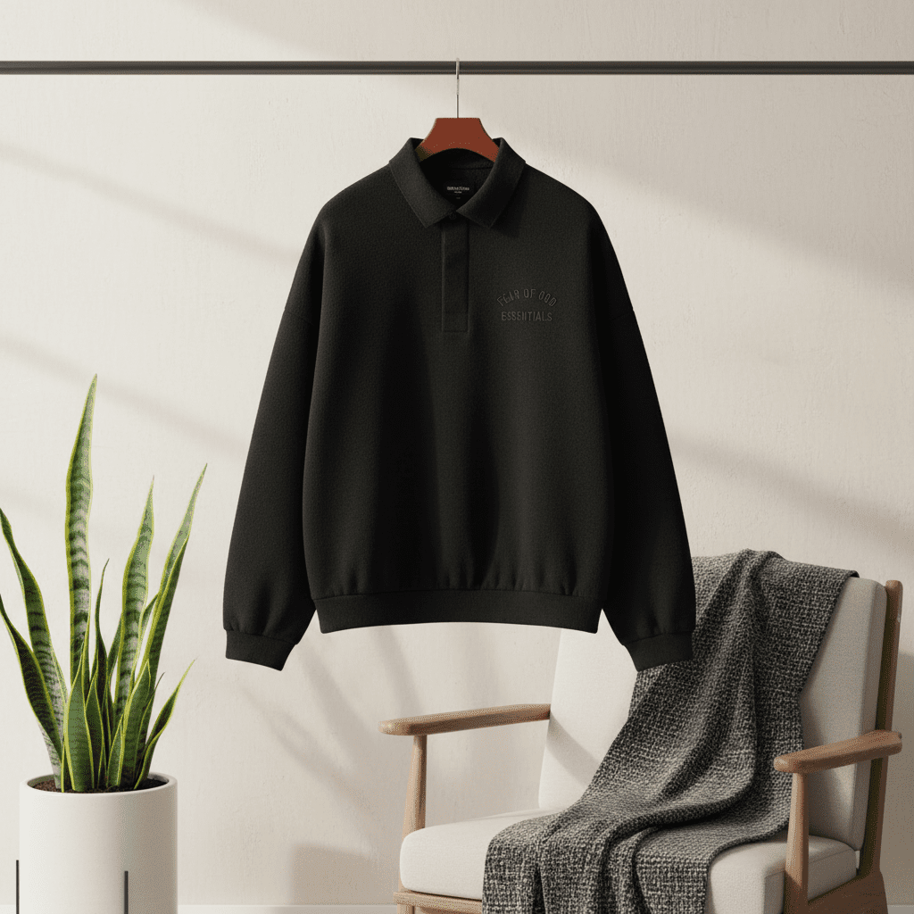 Fear of God Essentials Black Polo Sweatshirt crafted from premium cotton, soft and breathable. Classic collar with half placket and chest embroidery. Unisex streetwear for stylish daily comfort.