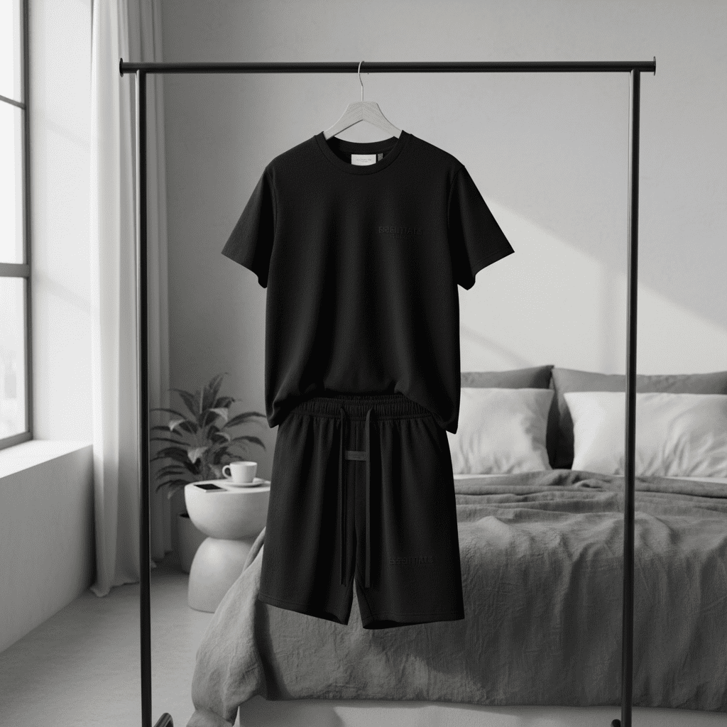 Essentials Black Casual Set: Soft cotton fabric, minimalist design with subtle logo embroidery, breathable and unisex, ideal for daily wear, includes short-sleeve top and shorts, stylish, versatile, and comfortable.