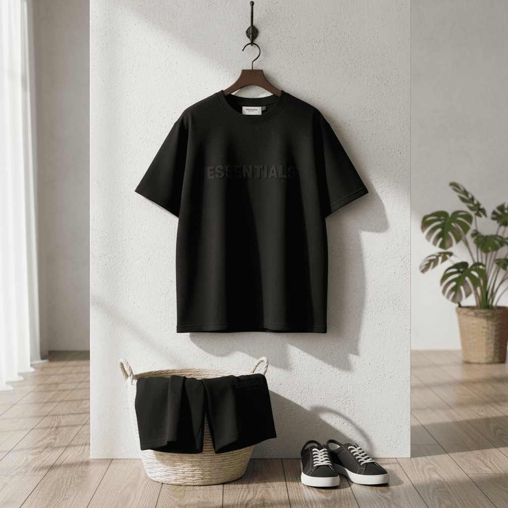 Essentials black T-shirt and shorts set, crafted from premium soft cotton, breathable and unisex. Minimal letter print, streetwear style by designer Jerry Lorenzo for modern casual comfort.