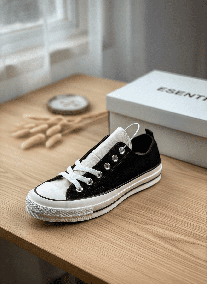 Essentials Black White Low Canvas Sneakers, crafted with premium canvas and durable rubber sole, classic lace-up with vintage distressed look, unisex design, stylish, comfortable, and perfect for daily wear.
