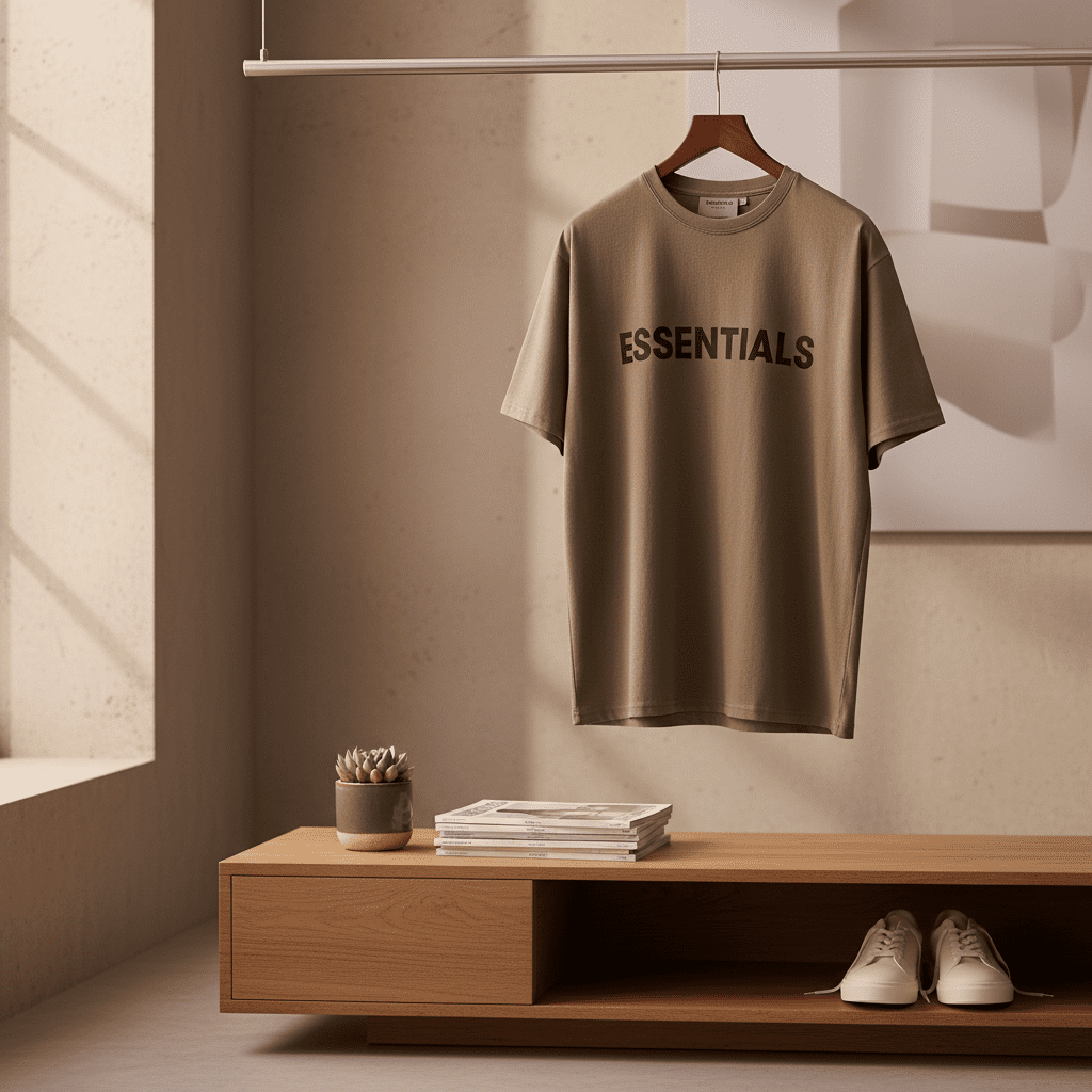 ESSENTIALS Khaki Oversized Cotton T-Shirt, soft breathable fabric with front logo print, unisex streetwear design, perfect for daily casual wear and effortless trendy style.