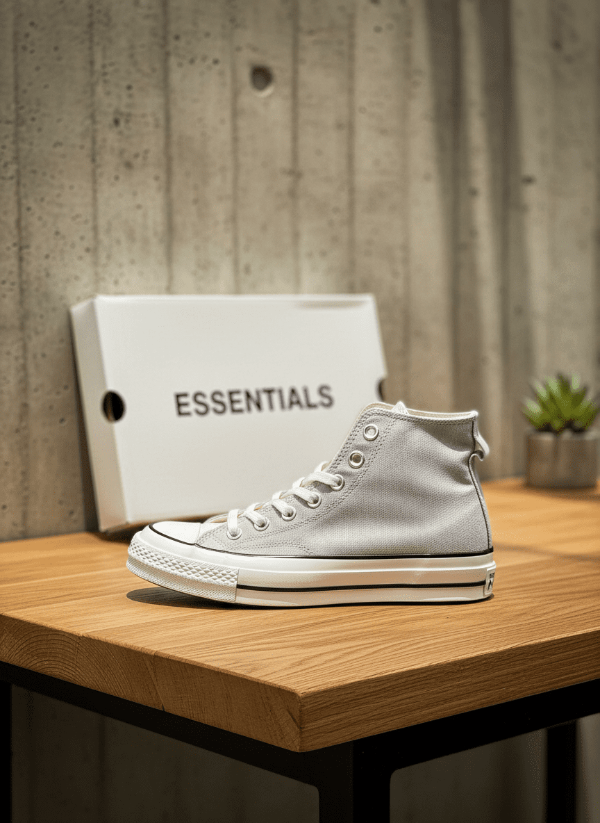 Essentials Light Grey High-Top Canvas Shoes, made with premium canvas, sleek design, snug ankle fit, white laces with off-white sole, unisex casual style, perfect for everyday street fashion.