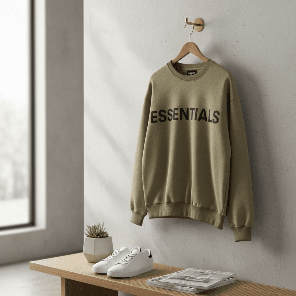 Essentials Khaki Crewneck Sweatshirt – made from soft cotton, featuring bold ESSENTIALS lettering on the back, unisex design, breathable comfort, perfect for casual streetwear style.