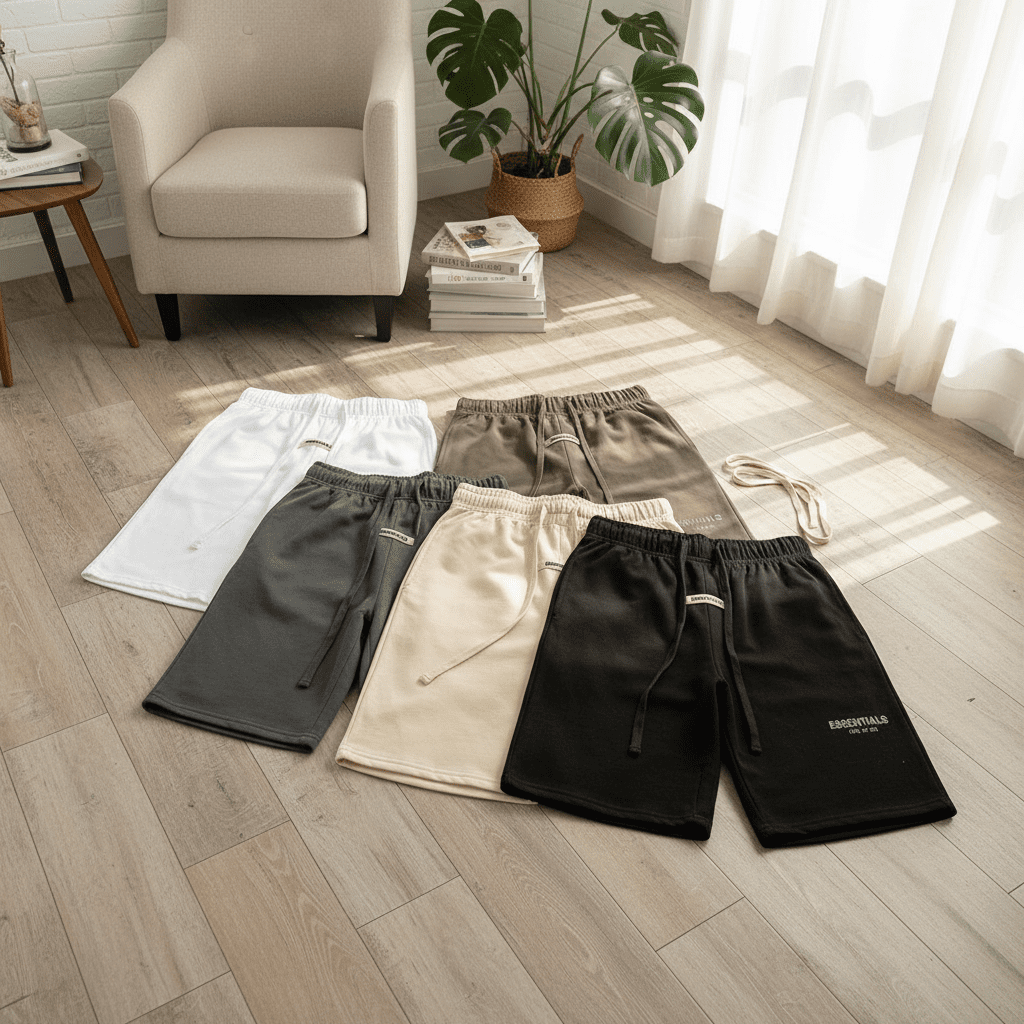 ESSENTIALS Black Casual Shorts, premium cotton fabric, elastic drawstring waist, side logo print, unisex streetwear style, breathable and comfortable for daily wear.