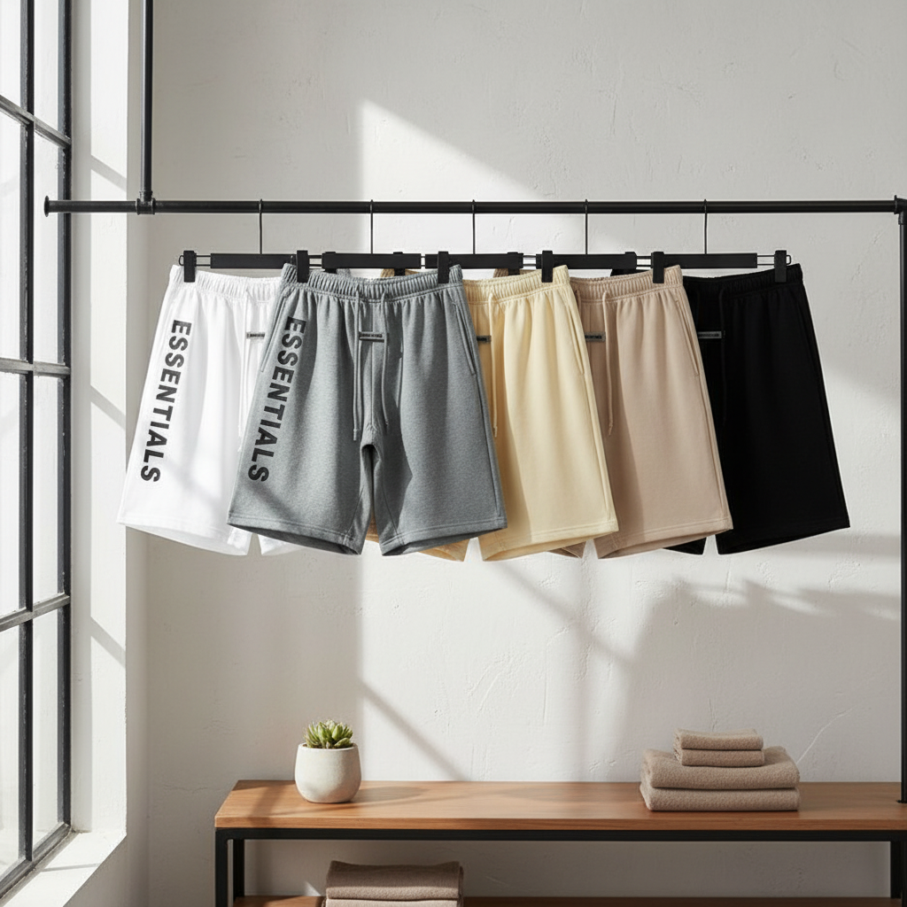Essentials White Cotton Shorts – soft, breathable premium fabric with vertical “ESSENTIALS” logo design. Streetwear style, unisex fit, perfect for daily comfort and casual wear.