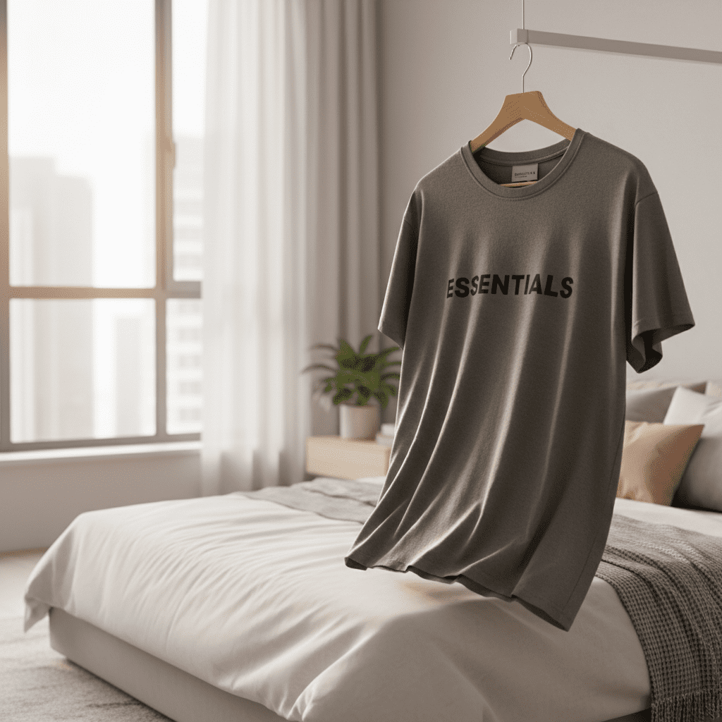 Essentials Grey Crew Neck T-Shirt made from premium cotton for breathable comfort. Features bold black “ESSENTIALS” logo on chest, unisex design, perfect for daily streetwear and casual style.