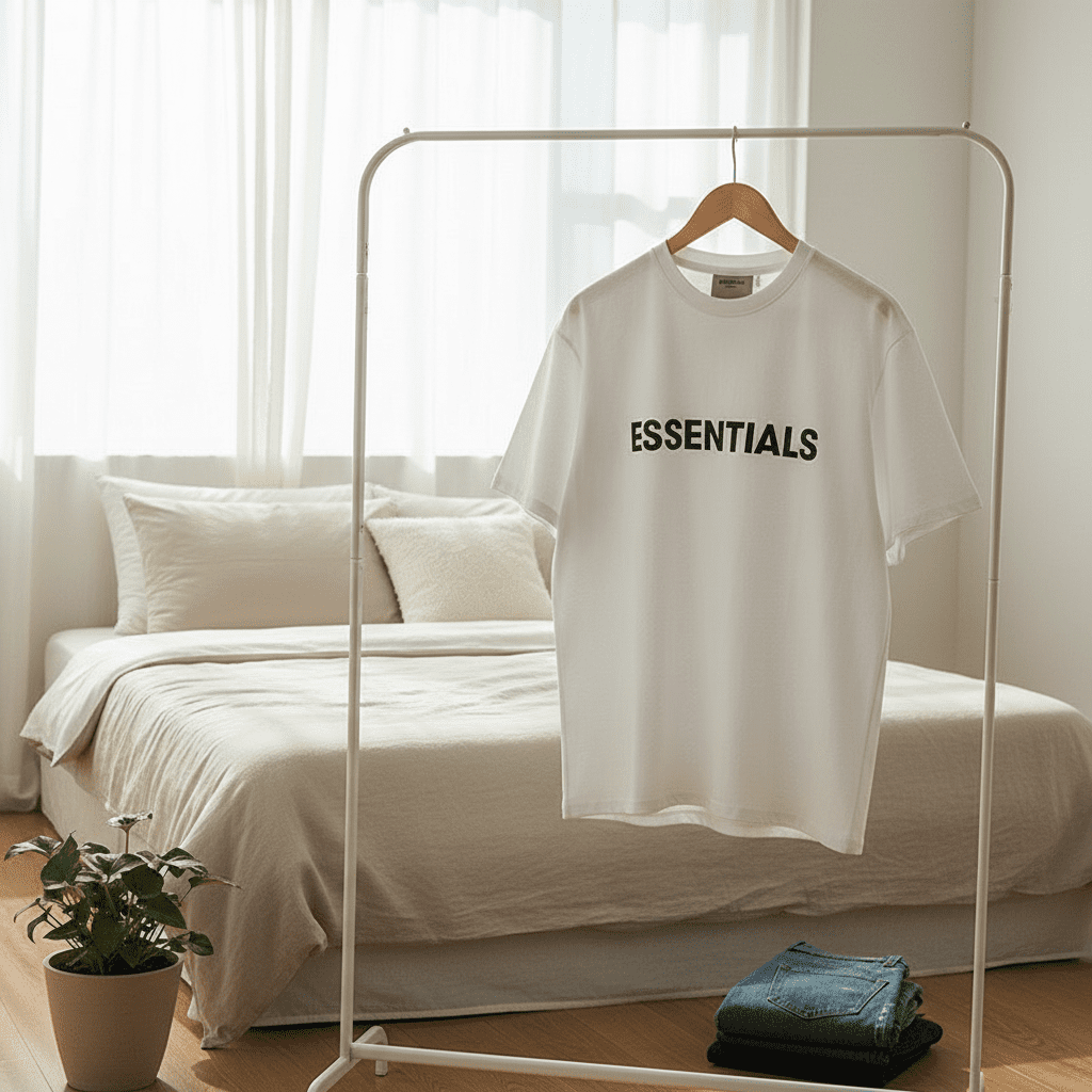 Essentials White T-Shirt, made from premium soft breathable cotton, features a black logo print, unisex loose fit, perfect for daily streetwear style with minimal and trendy vibes.