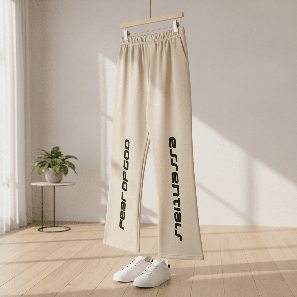 Fear of God Essentials beige wide-leg casual pants, soft breathable cotton, bold black logo on sides, unisex relaxed fit, streetwear style perfect for daily fashion and urban comfort.