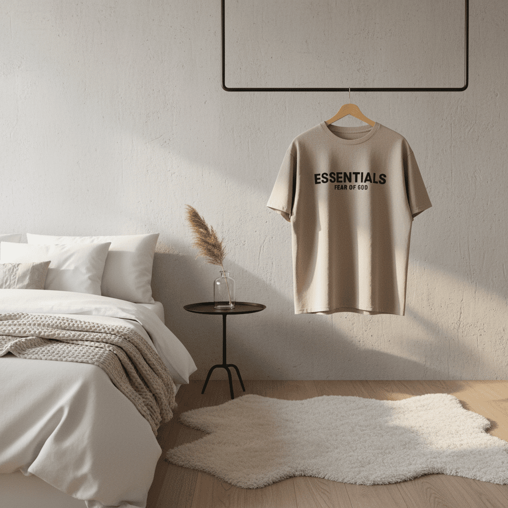 Fear of God Essentials beige T-shirt made from premium soft cotton, featuring bold black logo on the back. Unisex streetwear design perfect for casual everyday style and modern fashion lovers.