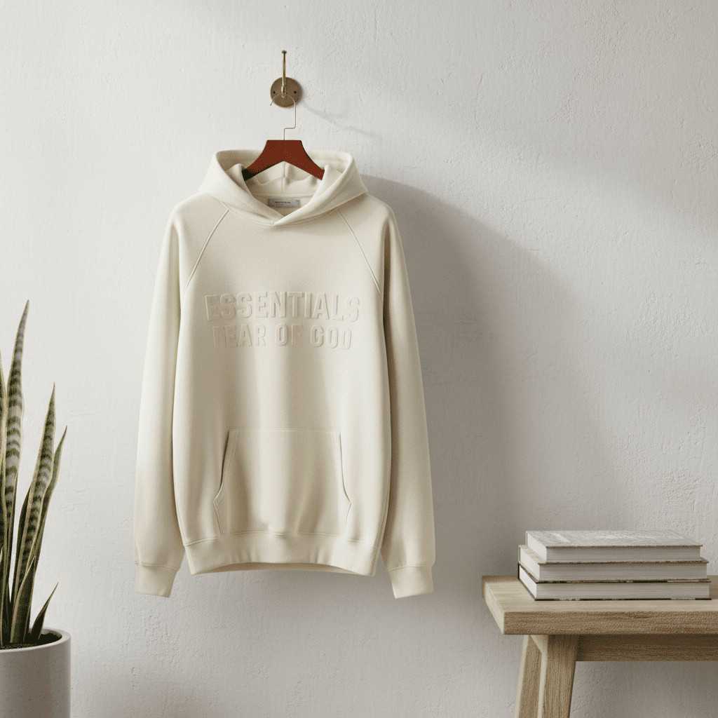 Fear of God Essentials Classic Off-White Hoodie, soft cotton fabric, logo graphic front, drawstring hood, kangaroo pocket, streetwear unisex style, casual comfort with fashion flair.