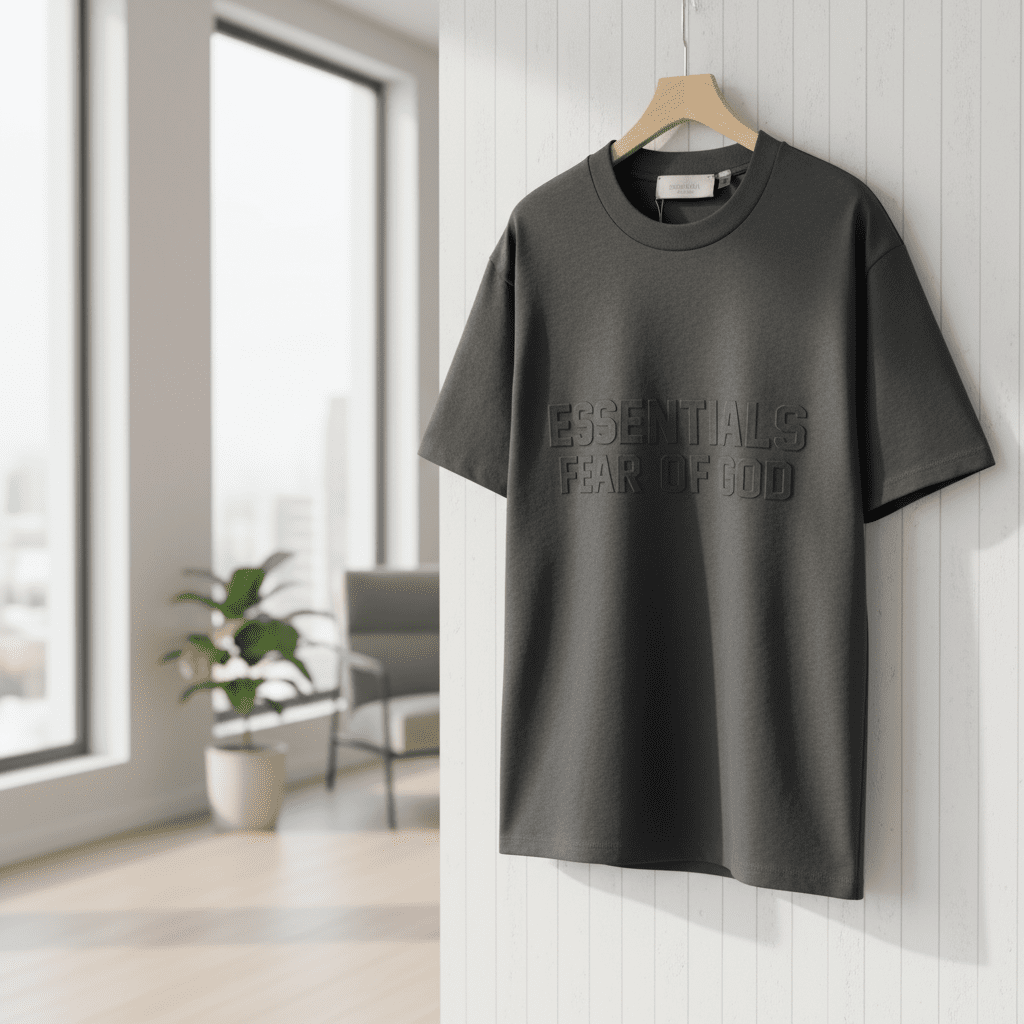Essentials Fear of God black T-shirt made from premium cotton, soft and breathable. Features embossed logo design, minimalist street style, unisex fit, perfect for daily casual wear with timeless comfort.