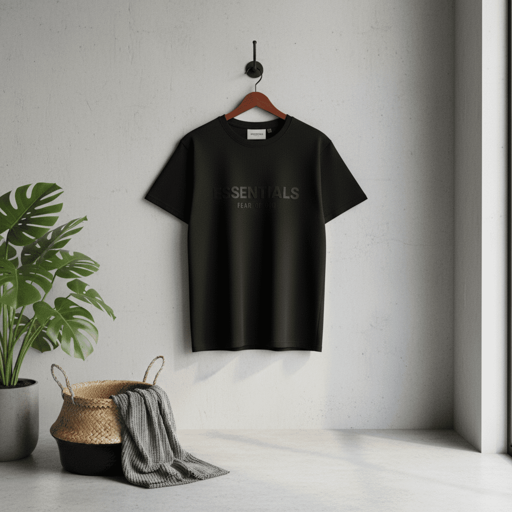 Essentials Fear of God Black Cotton T-Shirt, soft breathable fabric, stylish streetwear design, unisex fit for daily casual wear, minimalist yet trendy, perfect for modern fashion lovers.