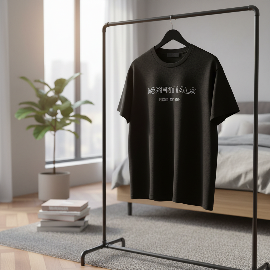 Fear of God Essentials black T-shirt made of premium soft cotton, featuring white “ESSENTIALS” and “FEAR OF GOD” logo print. Unisex streetwear style for daily casual fashion.