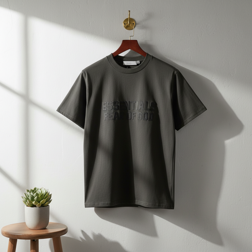 Fear of God Essentials black T-shirt made from premium breathable cotton, featuring signature logo print on chest. Designed by Jerry Lorenzo, unisex, minimalist streetwear for everyday casual style.