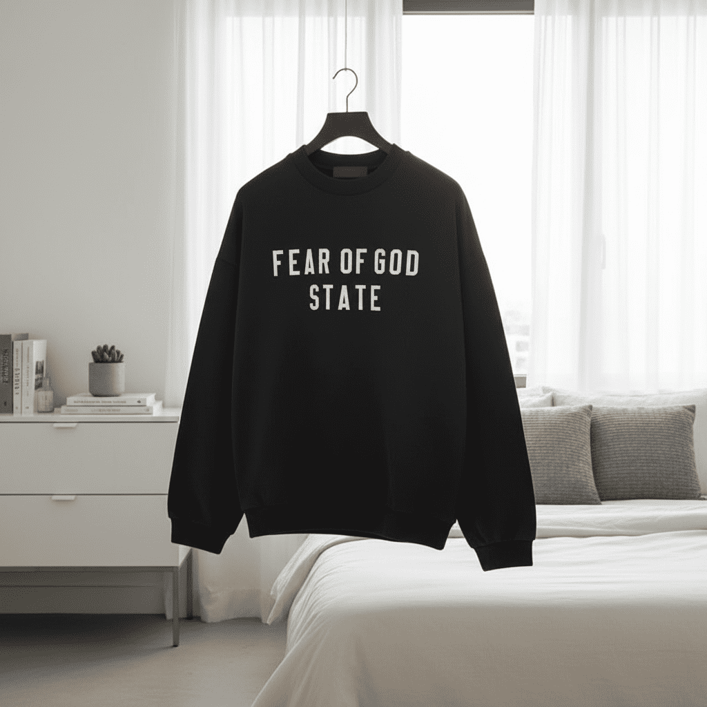 Fear of God Essentials State Black Crewneck Sweatshirt—premium cotton, soft and breathable, bold white chest logo, unisex streetwear style by Jerry Lorenzo for everyday casual comfort.