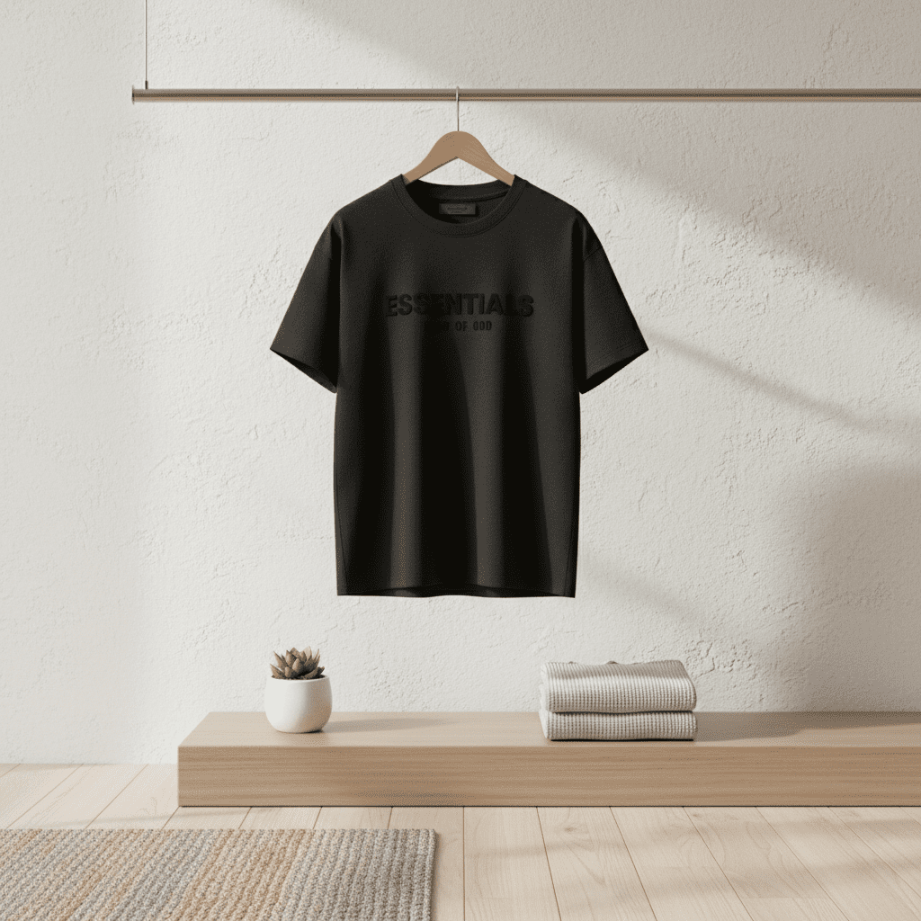 ESSENTIALS Fear of God black T-shirt made from premium cotton, soft and breathable. Bold back logo print design, unisex streetwear style perfect for daily casual fashion and urban looks.