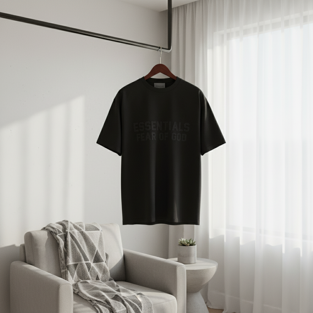 ESSENTIALS Fear of God black oversized T-shirt, made from premium breathable cotton, front logo print, unisex, streetwear style, perfect for daily casual outfit and modern fashion lovers.