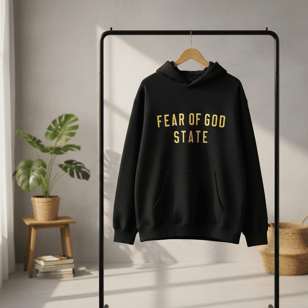 Fear of God Essentials black hoodie, premium cotton, yellow “FEAR OF GOD STATE” print, unisex streetwear style, warm and stylish for casual daily outfits.