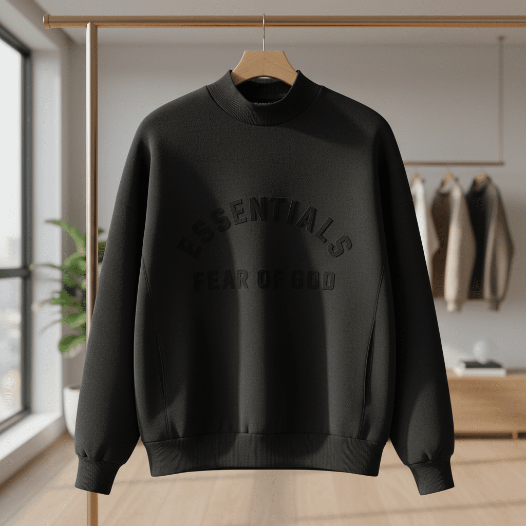Fear of God Essentials Black High Neck Sweatshirt, crafted from premium cotton, features arched ESSENTIALS lettering and logo, cozy unisex design, streetwear style perfect for everyday casual wear.