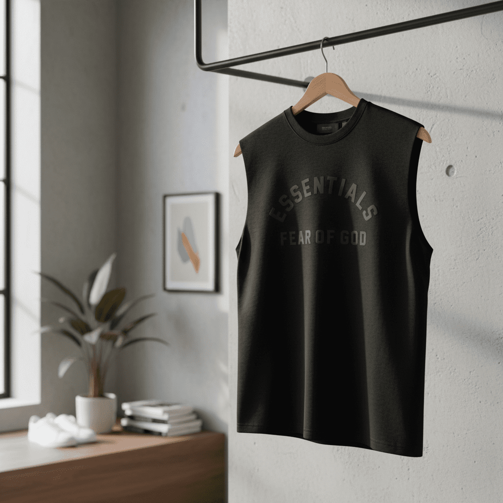 Fear of God Essentials black sleeveless tank top, made from soft breathable cotton with gray arch “ESSENTIALS” and “FEAR OF GOD” logo print, unisex streetwear style, perfect for daily casual looks.