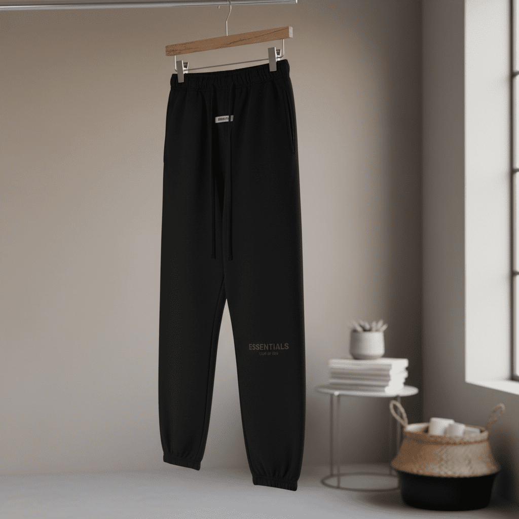 Essentials Black Jogger Pants feature premium cotton fabric, soft and breathable touch, adjustable drawstring waist, ankle-fit design, logo print detail, streetwear style for men and women.