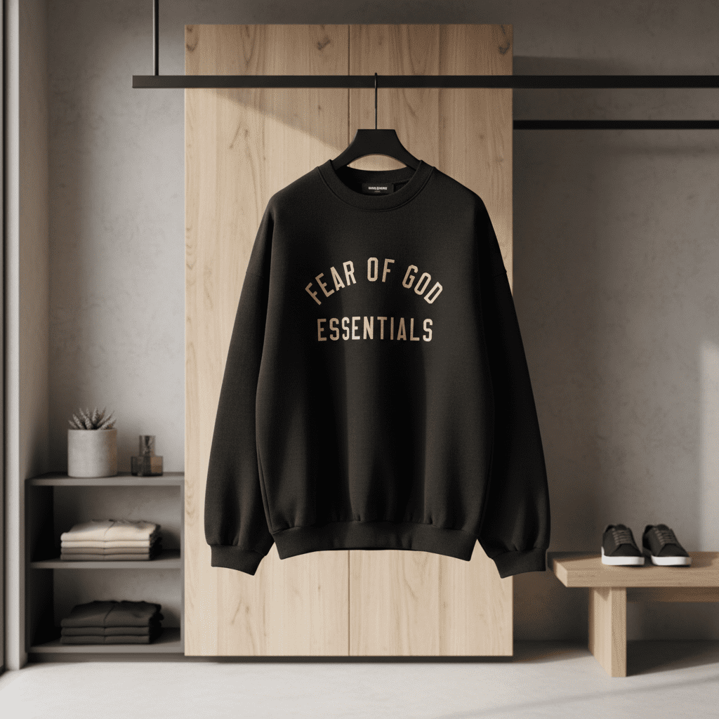 Fear of God Essentials black crewneck sweatshirt, made from soft cotton for ultimate comfort. Features gold logo print, relaxed unisex fit, perfect for streetwear and daily casual style.