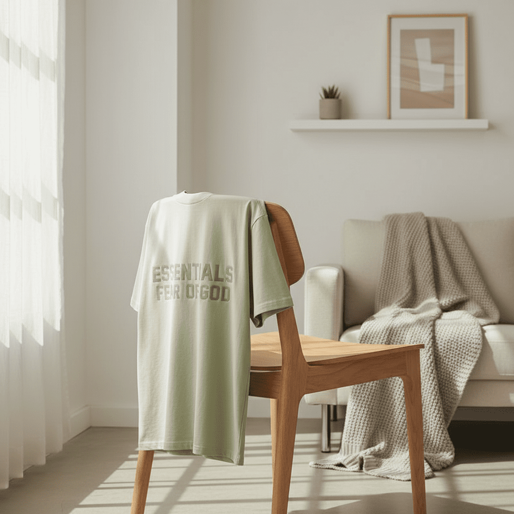 Fear of God Essentials T-Shirt in light khaki, made from soft breathable cotton, featuring Essentials and Fear of God logo print. Unisex casual streetwear for stylish everyday looks.
