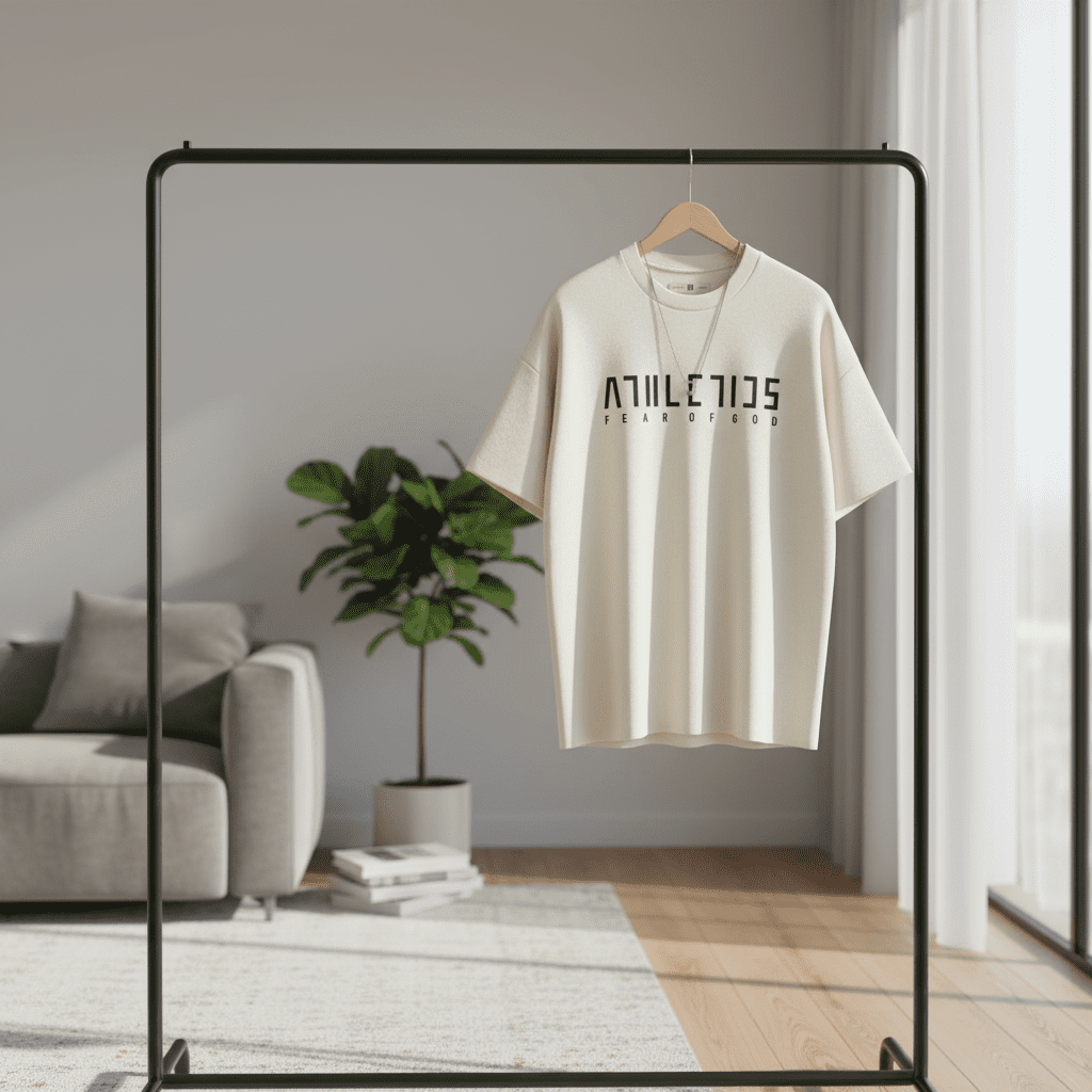 Fear of God Essentials Off-White T-Shirt, unisex casual streetwear, soft breathable cotton, reverse logo print design, timeless minimalist style for everyday fashion comfort.