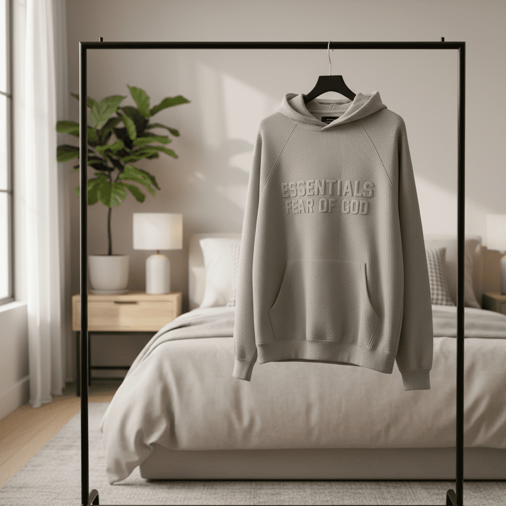 Essentials Fear of God light gray waffle hoodie, crafted from soft breathable fabric, features a classic hood, kangaroo pocket, and signature logo print. Unisex streetwear for everyday comfort and style.
