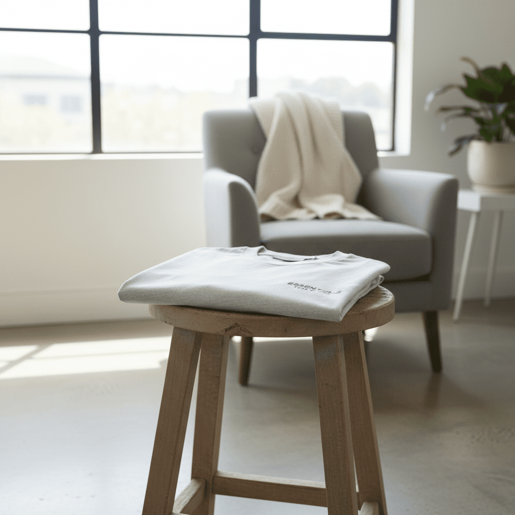 Essentials Fear of God light gray cotton T-shirt, soft and breathable fabric, chest logo print, minimalist street style, unisex design, perfect for daily casual wear.