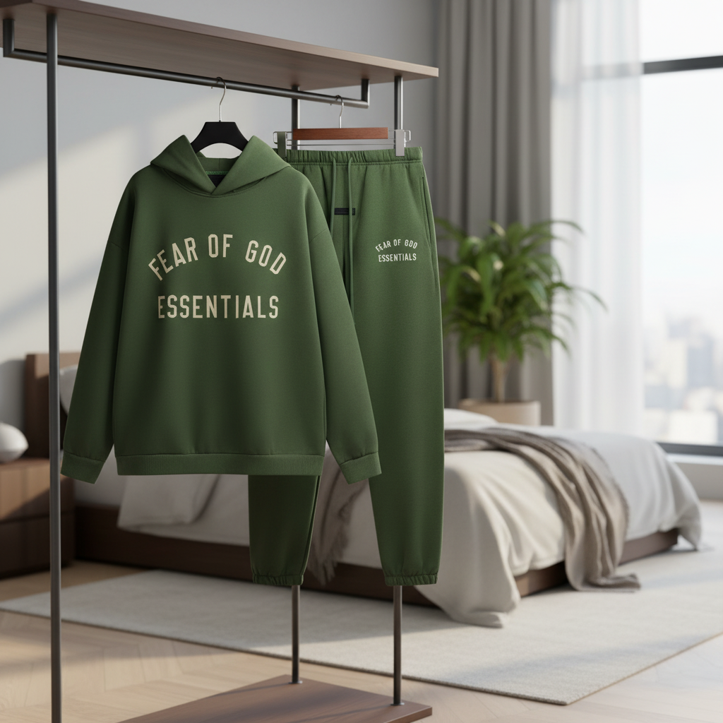 Fear of God Essentials olive green hoodie set features soft cotton fabric, adjustable drawstring hood, logo print on chest and pants, unisex fit, streetwear style, perfect for daily casual fashion.