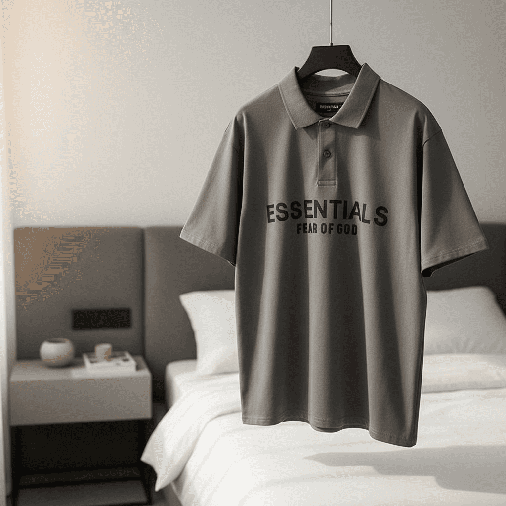 Fear of God Essentials Grey Cotton Polo T-Shirt features soft breathable fabric, bold back logo design, unisex fit, and minimalist street style perfect for everyday casual fashion.