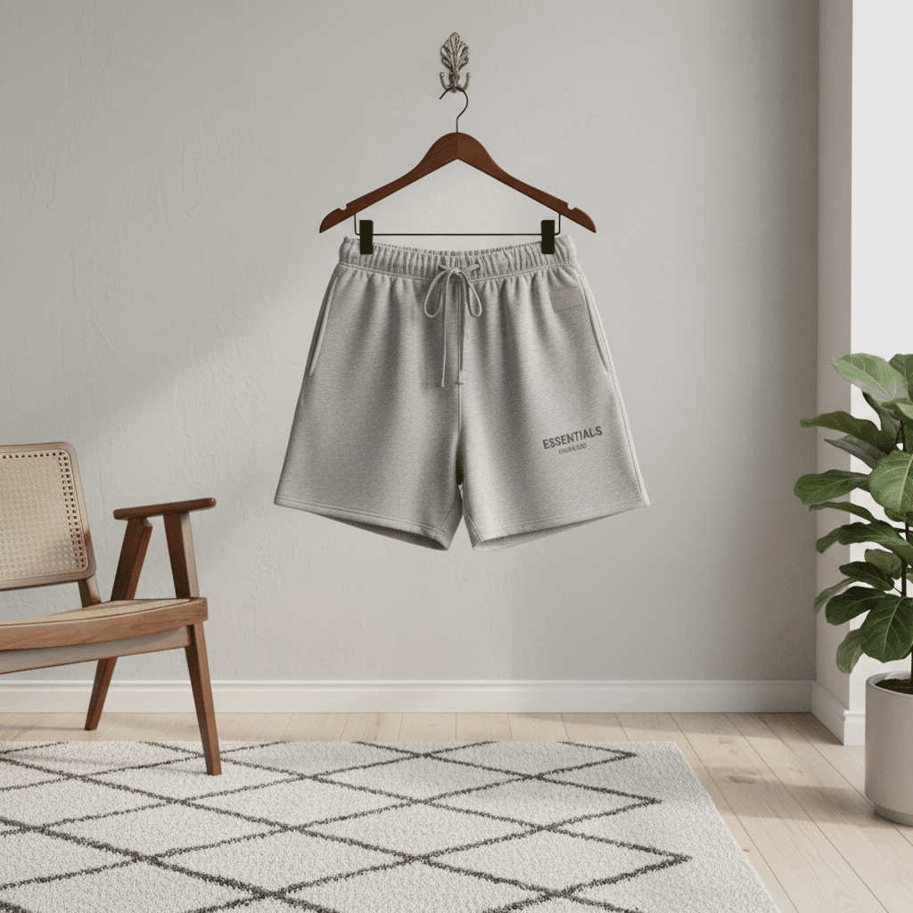 Fear of God Essentials Grey Cotton Shorts, soft breathable fabric, adjustable drawstring waist, practical side pockets, logo print, trendy streetwear style, unisex design for daily casual wear.