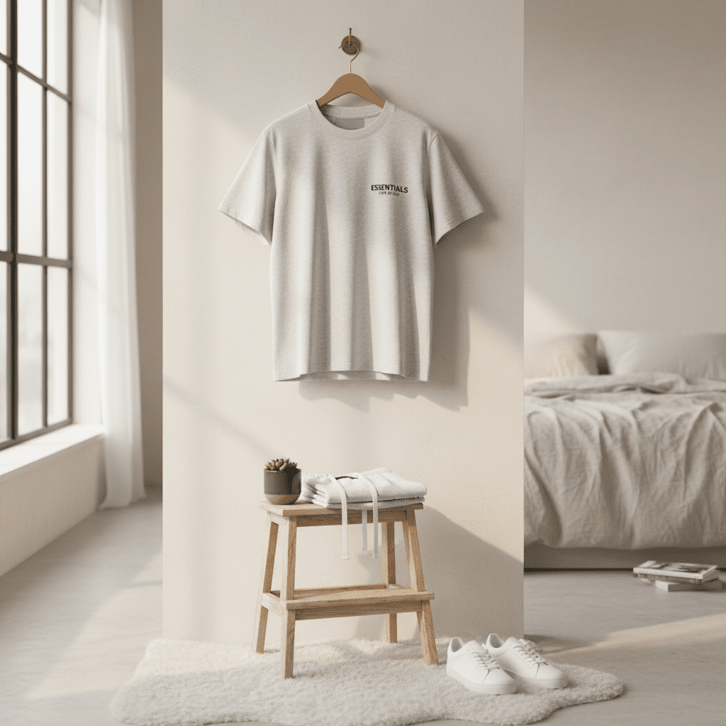 ESSENTIALS Light Gray Casual Set – Soft breathable cotton tee and shorts with logo print, minimalist street style, unisex fit, comfortable for daily wear, showcasing trendy modern design.