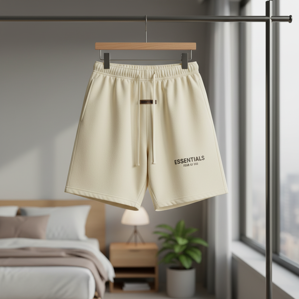 Fear of God Essentials off-white cotton shorts, featuring soft breathable fabric, elastic waist with drawstring, side logo print, unisex streetwear style, perfect for daily casual comfort.