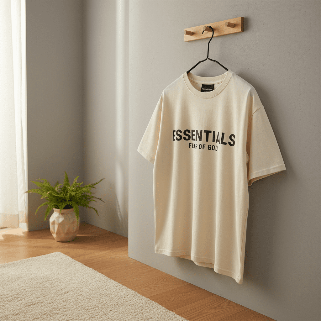 Fear of God Essentials T-Shirt in off-white, made from premium soft cotton. Features bold black ESSENTIALS and FEAR OF GOD print on back. Unisex streetwear for daily casual style.