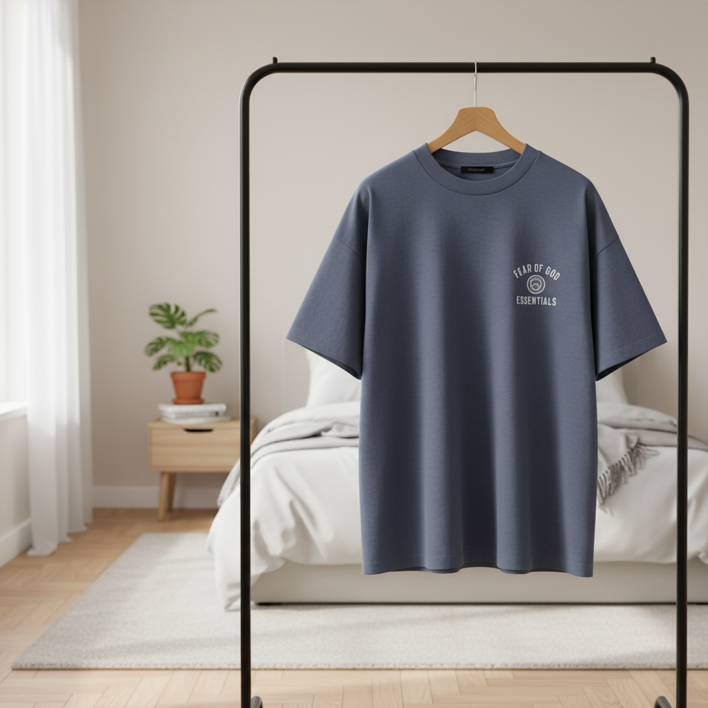 Fear of God Essentials deep blue cotton T-shirt featuring round logo on chest, relaxed fit, breathable streetwear style, perfect for men and women, ideal for daily casual outfits.