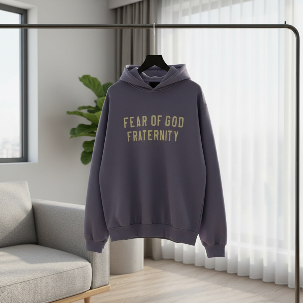 Fear of God Essentials lavender hoodie with "FEAR OF GOD FRATERNITY" print, soft cotton, unisex streetwear style, perfect for casual fashion and everyday comfort.