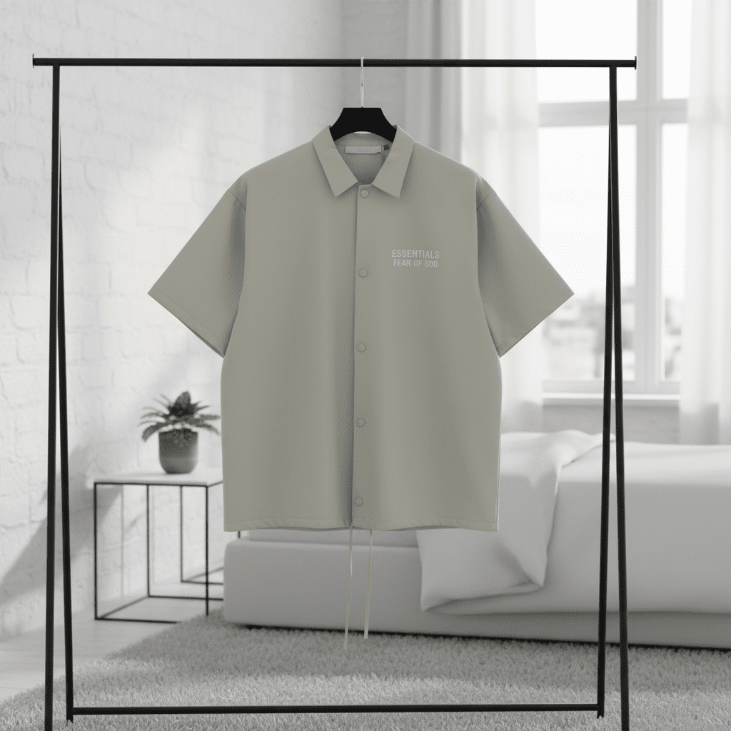 Essentials Fear of God sage green short-sleeve shirt, lightweight breathable fabric, button-down collar, logo on chest, drawstring hem, unisex loose fit, perfect for casual streetwear style.