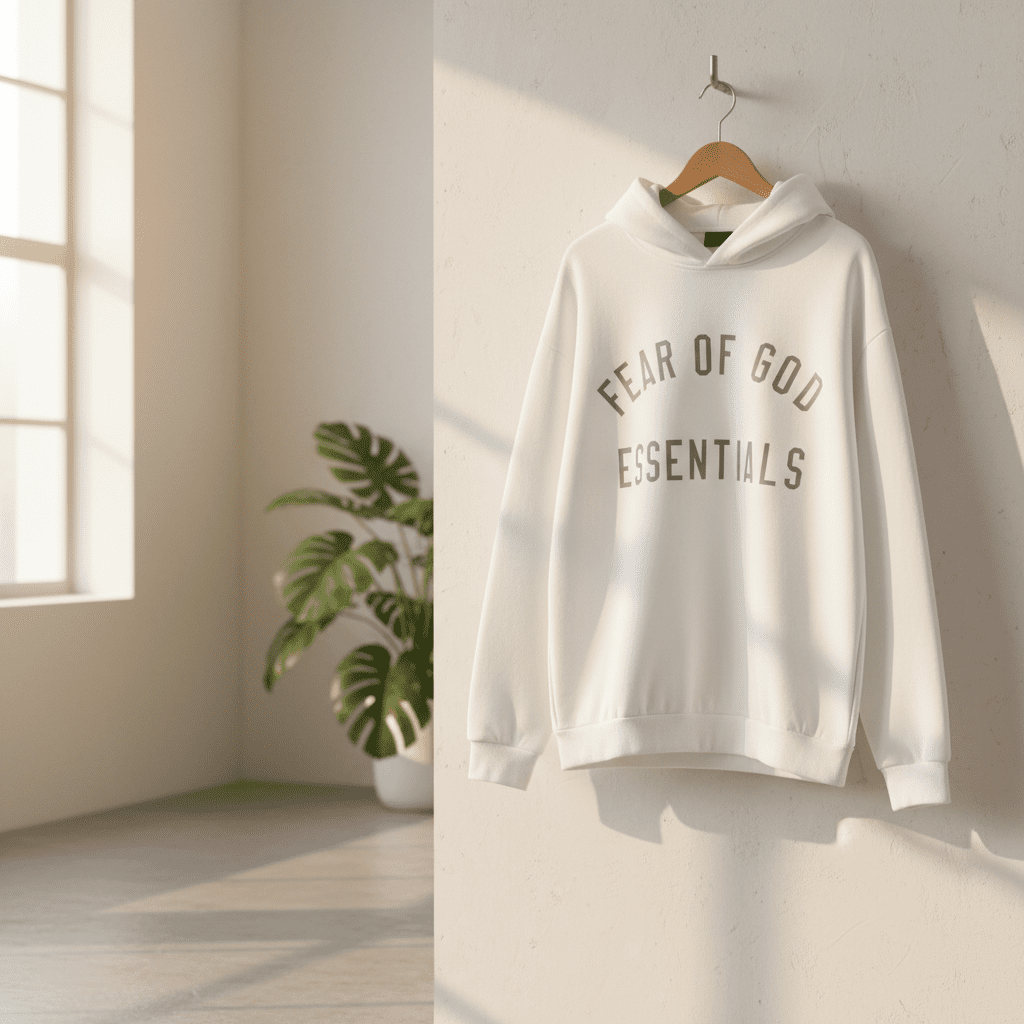 Fear of God Essentials White Hoodie: premium soft breathable cotton, gray logo print, drawstring hood, unisex streetwear style, perfect for daily casual fashion comfort.